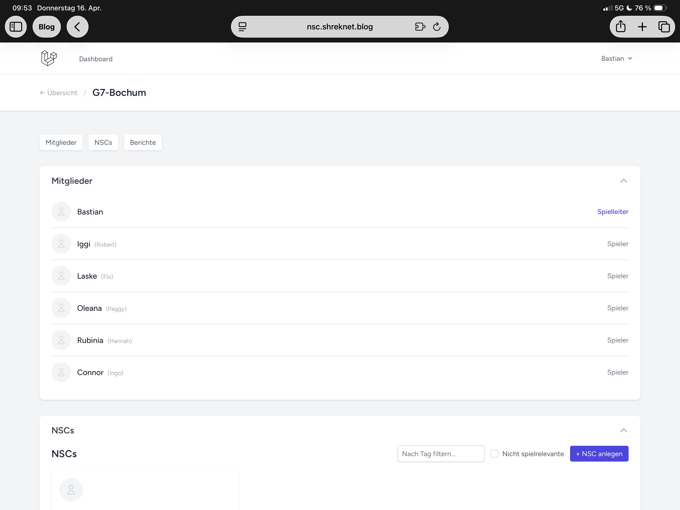 Ich wollte nicht für jede Gruppe eine eigene Lösung finden, sondern eine globale Lösung. Menschen sollten sich einloggen können, dann ihre Gruppe auswählen und dann direkt alles sehen, was wichtig ist. Für mich als Spielleiter war dabei wichtig, dass es einen Unterschied zwischen Spielern und Spielleitern geben muss. Spielleiter müssen mehr sehen, sich Notizen machen können und eventuell auch Sachen klarstellen.