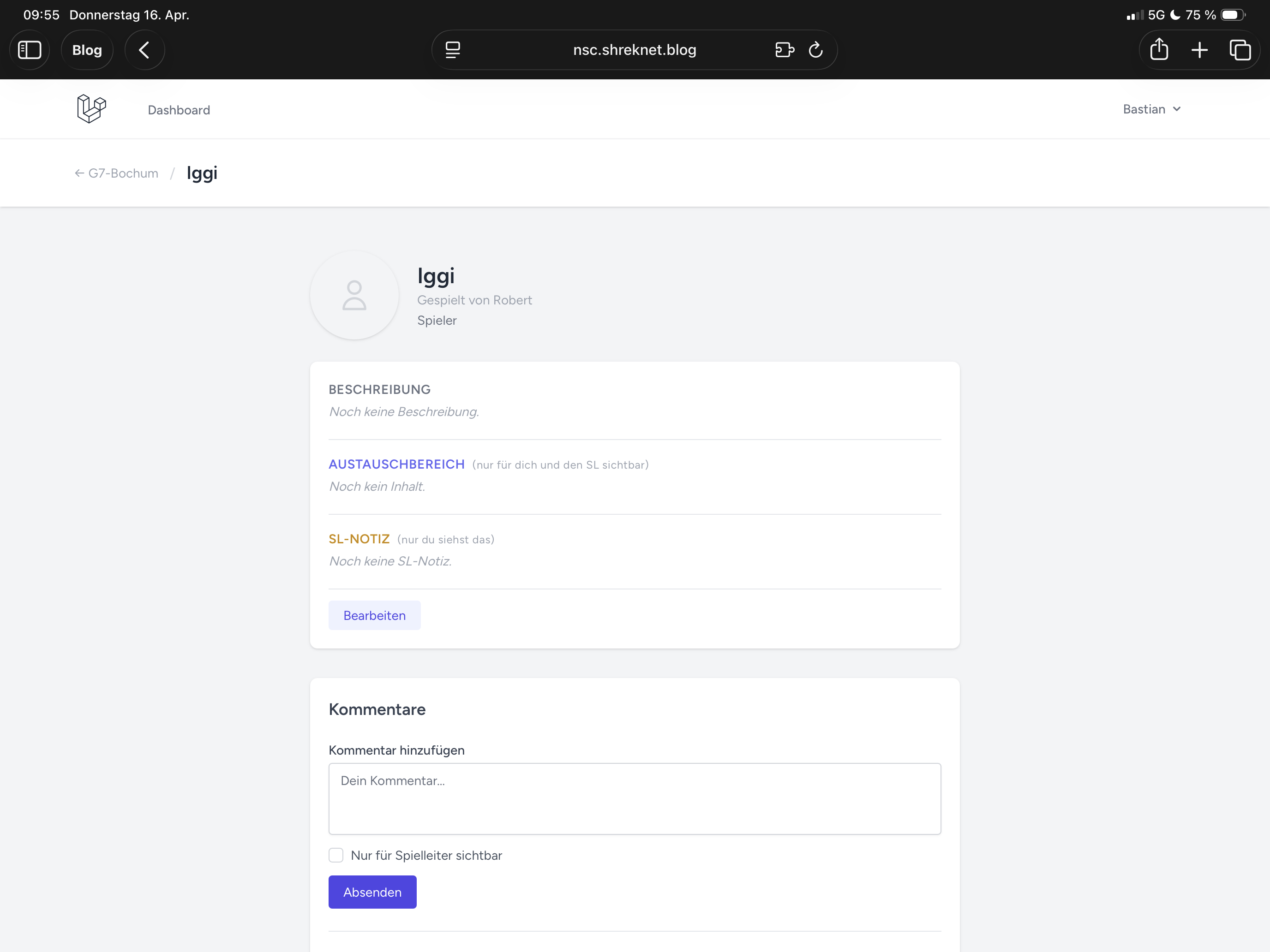 Gehen wir das mal der Reihe nach durch. In der Ansicht der Spieler kann ich bei jedem Spieler den Charakternamen sehen, eine Beschreibung des Charakters sehen und Kommentare verfassen.