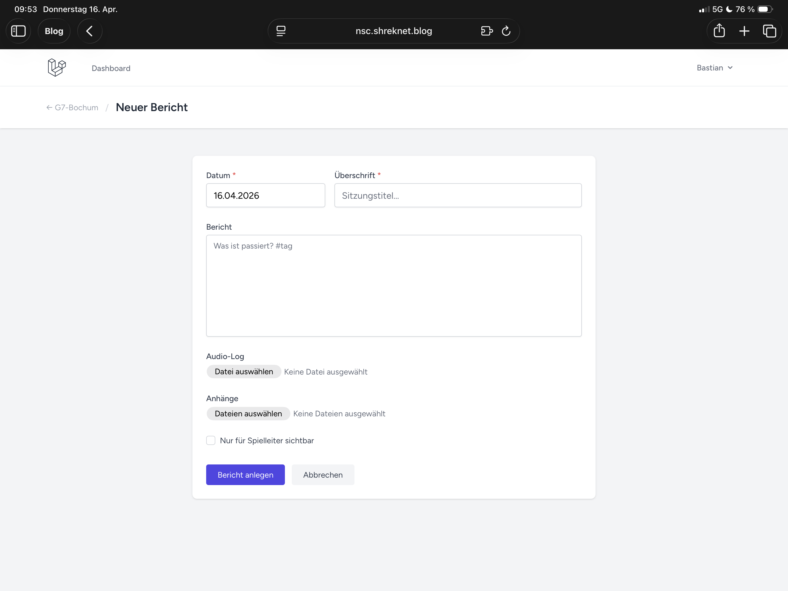 Berichte können ebenfalls angelegt, angesehen und bearbeitet werden. In einem Bericht ist ein Datum, eine Beschreibung und der Upload von einer Audio und Files. Files für zum Beispiel Handouts, Karten und Notizen. Das Audiofile ist für meine Rollenspielrunde wichtig, da wir das Recap des letzten Spielabends immer als Diktat aufnehmen.